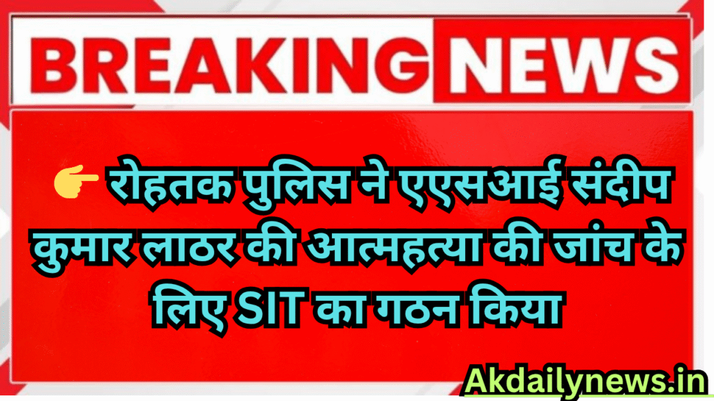 हरियाणा के रोहतक जिले में तैनात साइबर सेल के एएसआई संदीप कुमार लाठर की आत्महत्या के मामले ने पुलिस विभाग में हड़कंप मचा दिया है। मामले की गंभीरता को देखते हुए रोहतक पुलिस ने जांच के लिए विशेष जांच दल (SIT) का गठन किया है। यह SIT घटना के हर पहलू की गहराई से जांच करेगी।