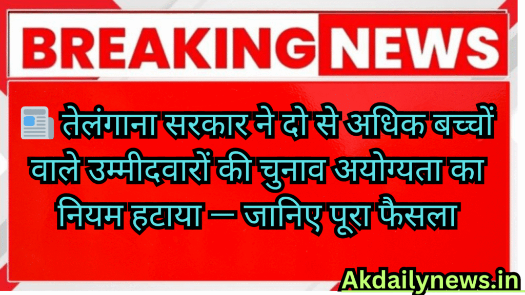 📰 तेलंगाना सरकार ने दो से अधिक बच्चों वाले उम्मीदवारों की चुनाव अयोग्यता का नियम हटाया — जानिए पूरा फैसला ‣ Akdailynews